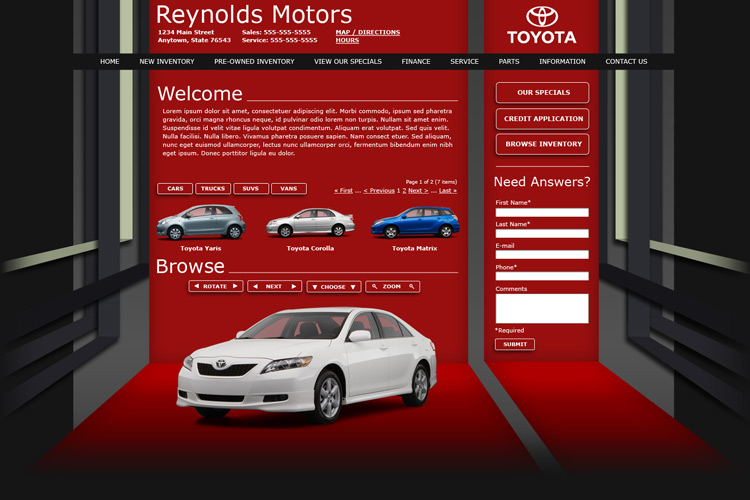 This template was one of many theme designs available to over 8,000+ fully hosted automotive dealerships all over the world. Themes were fully dynamic and customizable within a specialized Content Management System.
