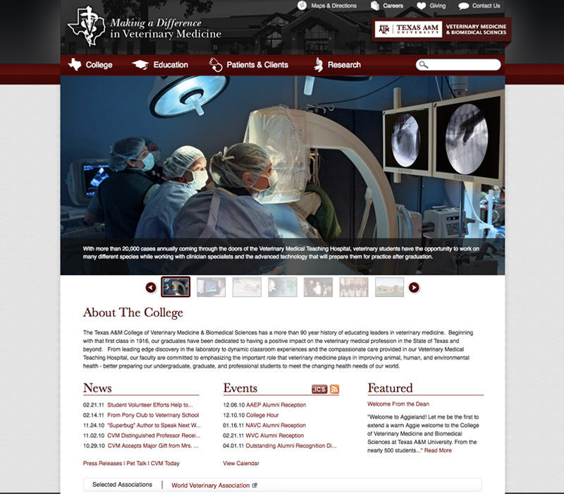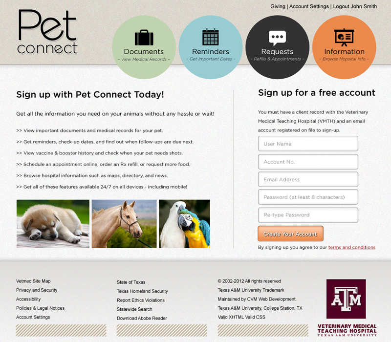 Later renamed to Texas A&M Vet Connect, this public-facing web application allows hospital clients to access their pet's medical records, schedule appointments, and request pharmacy refills among other useful features.